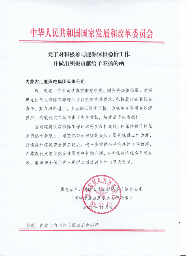 國家發(fā)改委關于對積極參與能源保供穩(wěn)價工作并做出積極貢獻給予表揚的函